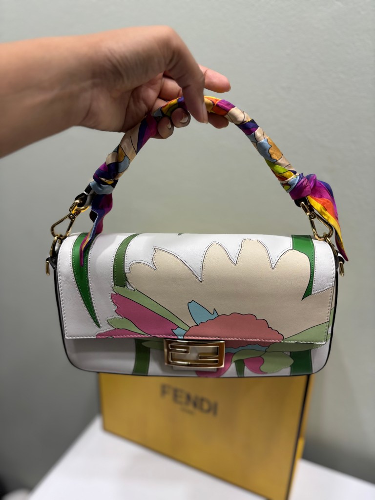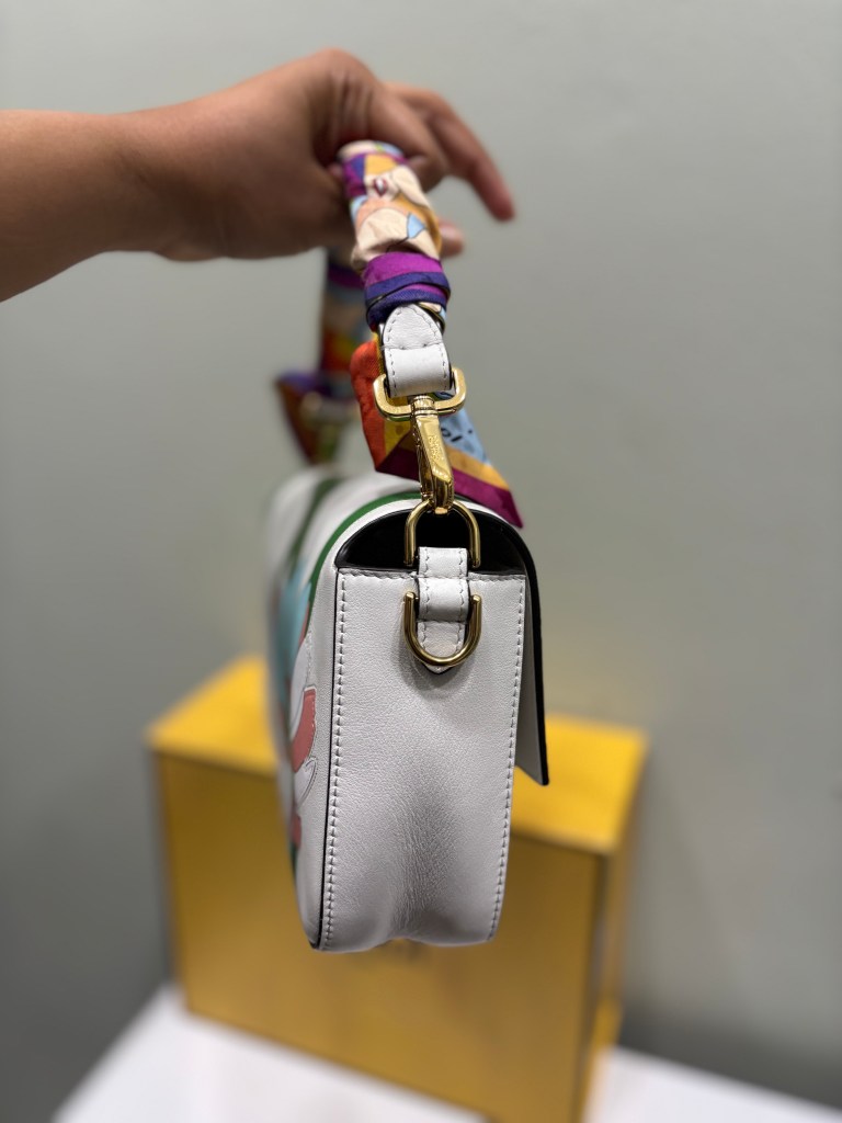 This version of the Fendi Baguette is from the SS20, designed by Silvia Venturini Fendi and comes in white calfskin leather with painted-on floral embellishments in keeping with the light pastels and floral springtime theme of that collection.